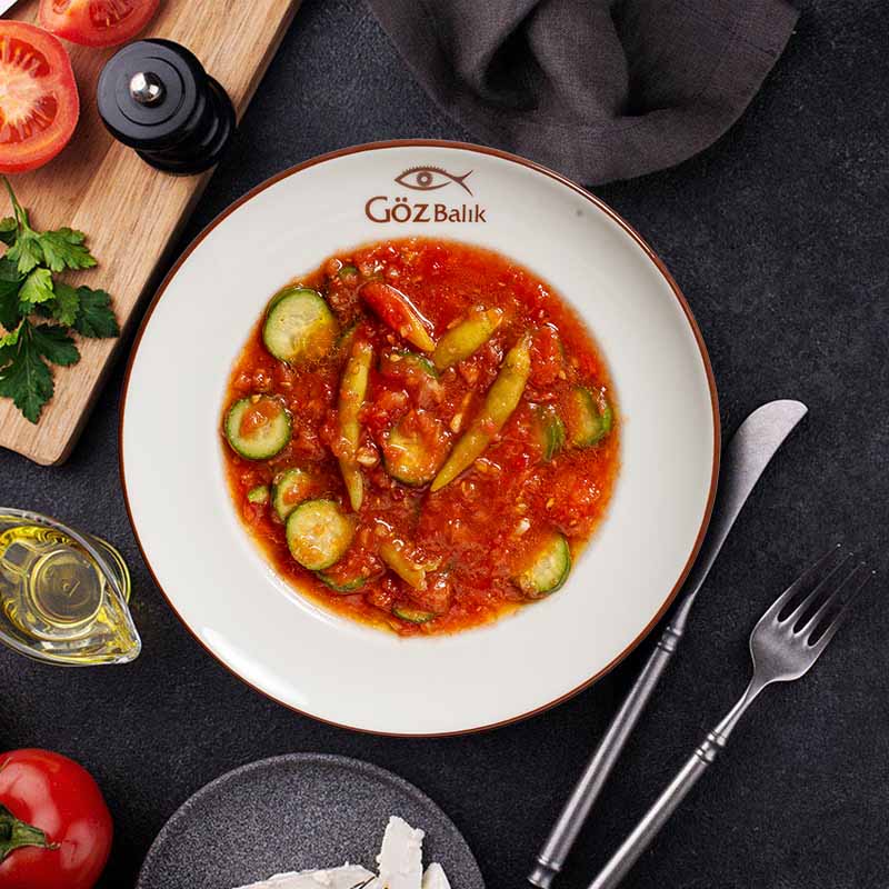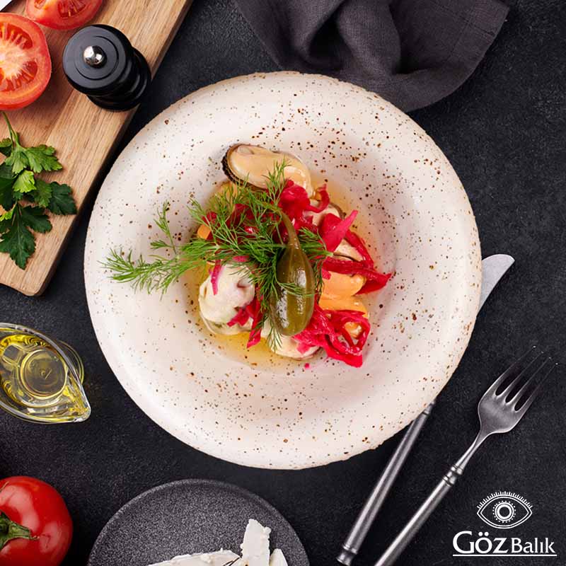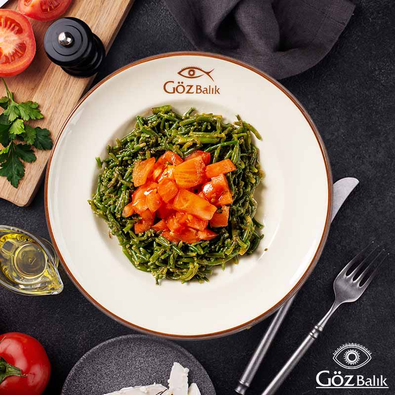 Haşlanmış Tarla Börülcesi, Al Biber, Kırmızı Soğan, Dereoutu, Maydanoz, Salatalık Turşusu, Zeytinyağı, Limon