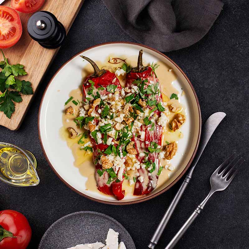Süzme Yoğurt, Kavrulmuş Ceviz, Kavrulmuş Atom Biberi, Kurutulmuş Domates, Susam, Maydanoz